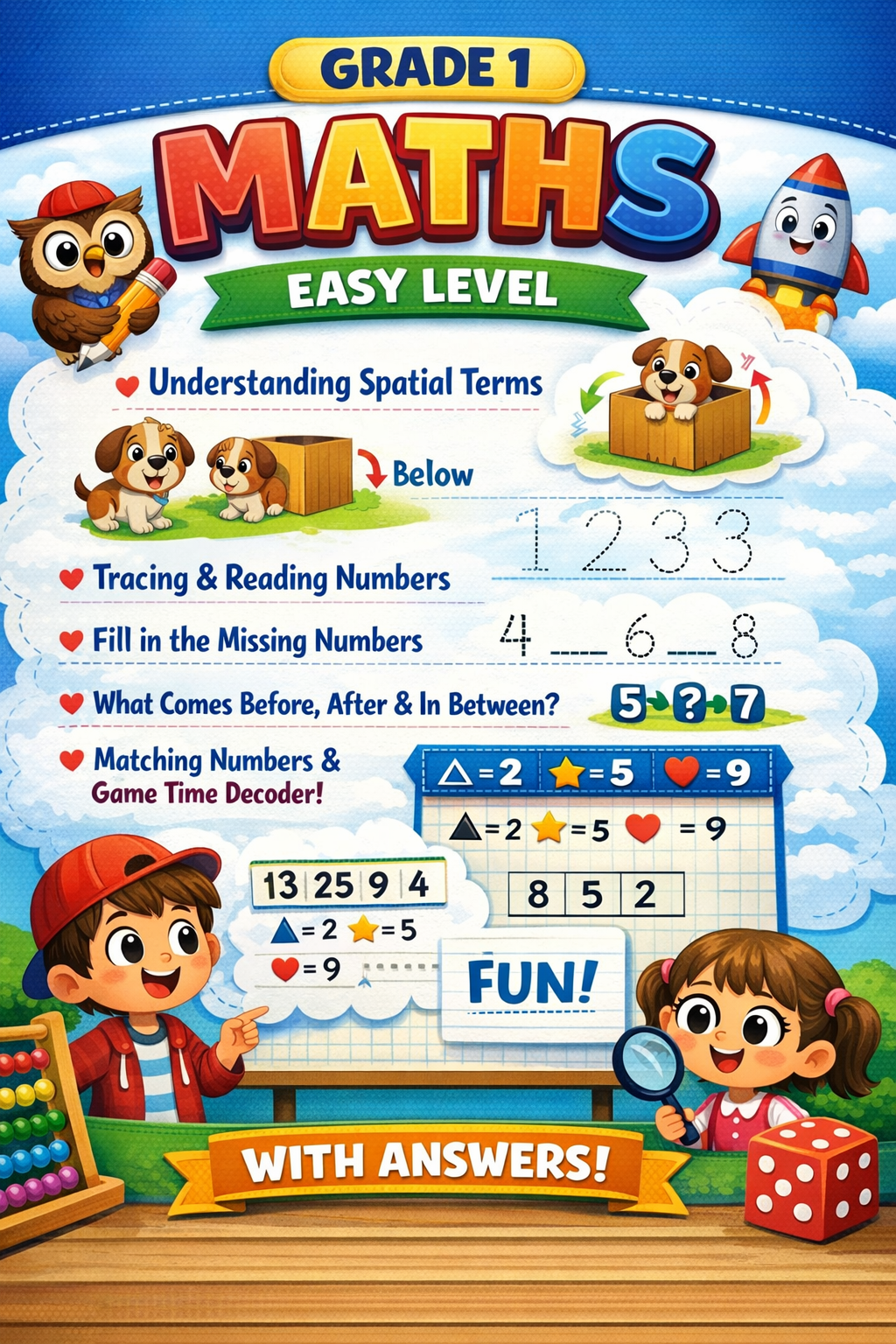Understanding Spatial Terms, Tracing and Reading Numbers, Fill in the Missing Numbers, What Comes Before, After, and In Between, Matching Numbers and Game Time Decoder